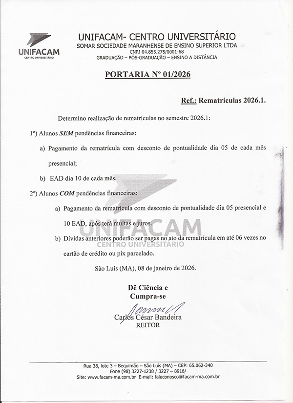 Boleto de pagamento da Rematrícula de 2026-1 já disponível no Site da FACAM....
