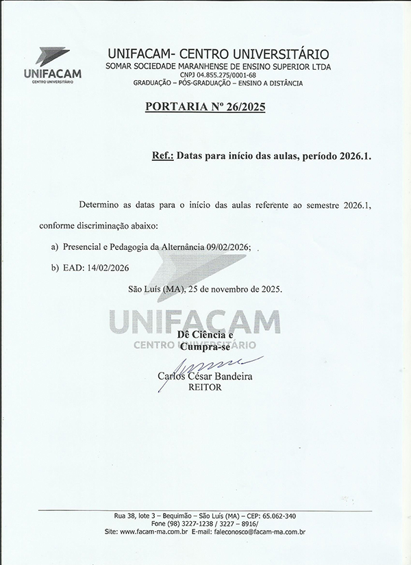 Portaria sobre o início das aulas do período letivo de 2026-1